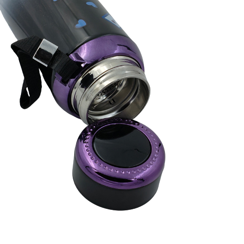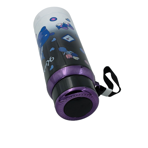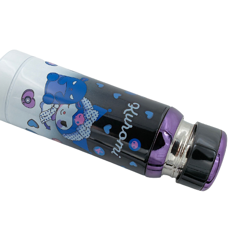 Enjoy your favorite beverages with this stylish 800ml thermal bottle featuring popular character Kuromi. The bottle boasts a modern purple-to-black gradient finish decorated with Kuromi graphics and heart patterns. It is designed for convenience, featuring a secure lid with a durable carrying strap for easy transportation. Additionally, the bottle includes an internal tea strainer, making it perfect for brewing loose-leaf tea on the go.