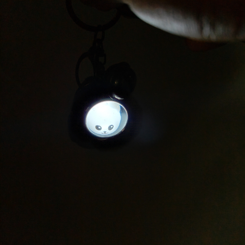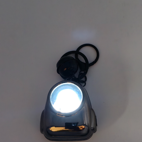 This charming keychain features a glossy, metallic-finished housing shaped like a small backpack or space helmet. Inside is a cute white panda figure. The keychain includes a functional LED light that illuminates the panda figure from within when activated. It comes with a small black bell and a sturdy keyring for attaching to bags, keys, or zippers.