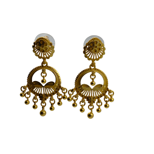 Elegant gold-tone jhumka earrings featuring intricate filigree craftsmanship and floral accents, perfect for traditional and festive wear.